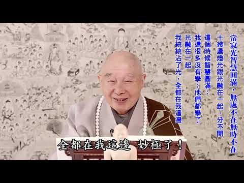 所以你看,淨土法門最高的一層,常寂光,完全融入常寂光。常寂光就是法身,就是一體。像我們房間,十幾盞燈統統打開,光跟光融在一起,分不開。這個時候智慧圓滿,為什麼?我還很多東西沒有學,他們都學了,現在都變成光融在一起,所有人學的我統統都沾了光,全都在我這邊,妙極了!真正是無所不知,無所不能,證得大圓滿。這個時候才能真正幫助一切苦難眾生。時間沒有了,沒有過去現在未來;空間沒有了,沒有距離,一片光明,在哪裡?無處不在,無時不在。所以佛現前給我們看,佛從哪裡來的?《楞嚴經》上說的「當處出生,隨處滅盡」,它講得這麼好,他沒有來去,他跟我們沒有距離。所有的一切佛、菩薩、神明,一切眾生,跟我們統統都沒有距離。如果有距離,那個麻煩,他沒有距離。所以佛菩薩只是幫助我們回頭是岸。回頭從哪裡回頭?從起心動念回頭,別起心動念;從分別回頭,不要分別;從執著回頭,別執著,那就是圓圓滿滿本來是佛,回歸到你的本位,你證得大圓滿。這個裡頭學習其味無窮。