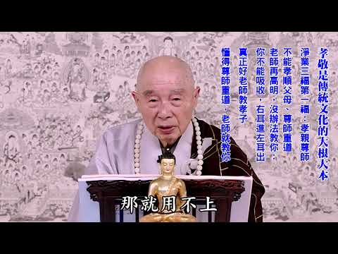 戒律是什麼?戒律是把經典落實。經教學了,學了沒去做,這不行,沒用處,一定要做到。從哪裡做起?剛才講的五戒十善,對自己要非常嚴格,才能產生效果。所以以後我在美國有一段時間,那個時候是到處流浪,每年總是美國、加拿大要轉兩圈,十幾個城市都有同學同修,跟他們見見面,學習經教,成立淨宗學會。當年我在的時候,有三十多個學會,現在可能只剩下十個。我提出戒律五科,我們修淨土的人必須要學的。第一科,淨業三福。這東西不能太多,太多太雜了記不住,那就用不上。要好好記住,時時刻刻起心動念對照一下有沒有違背。淨業三福第一福,第一句就是「孝養父母」,第二句「奉事師長」,它跟咱們中國傳統文化完全相同。第一句孝親,第二句是尊師,尊師則重道,重道才尊師。不能孝順父母,不能夠尊師重道,老師再高明,沒有辦法教你。為什麼?你不能吸收,老師跟你說的,右耳進去左耳出去了,所以老師不教了。真正好老師教什麼?孝子,懂得尊重老師,尊師重道,老師就教你。我遇到三個老師,都是這個條件親近。那時候生活清苦,對老師一分錢的供養都沒有,老師真正教我,我們感恩。老師不在了,我們上課,我們在一起學習,老師的照片都在上面,沒有離開老師,就像老師看著我們一樣,跟當年的時候一樣。這也是告訴現代的年輕人,要懂得尊師重道,要懂得孝順父母。孝敬是傳統文化的大根大本,沒有孝敬兩個字,傳統文化就滅亡、就沒有了,不能不知道。